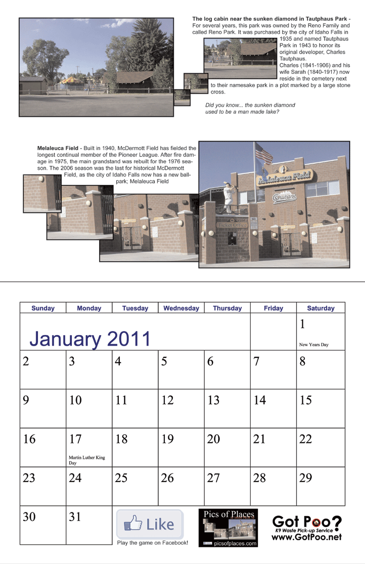 We are taking preorders for the 2012 "How well do you know Idaho Falls" calendars. We have teamed up with our friends at GoDavid Marketing Concepts to offer a full size, full color, glossy calendar from some of the pictures we have featured on our game... and some that were not! Opened, the calendar measures 11x17 with large enough calendar days to write in your appointments and reminders! Makes a super gift for someone who has had to move away from Idaho Falls!